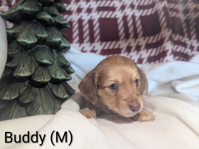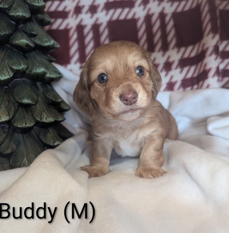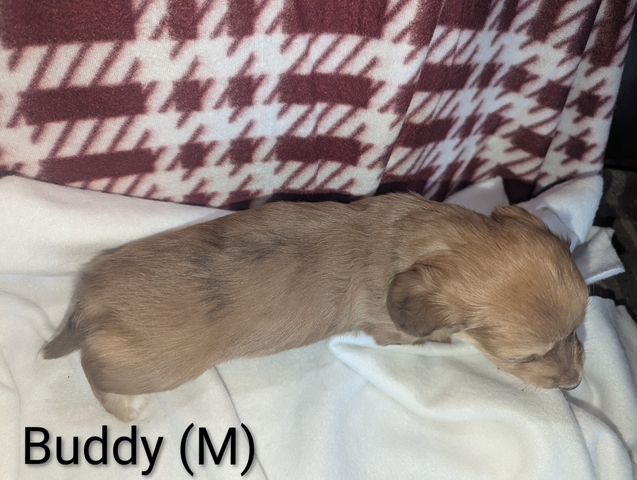 Long-Haired Mini Dachshund - READY NOW!! Buddy the Elf (Male). Buddy is laid back and ready for whatever fun comes his way. Full of kisses and snuggles! Bright blue eyes! Full AKC Registration, AKC Re-Unite Microchip, first round of vaccinations, dewormed, vet health check, and a Puppy Starter Pack! Raised in the home with family and other dogs. Born 11/7/25 weaned and ready to go before Christmas! Located in McPherson KS. $1,500.