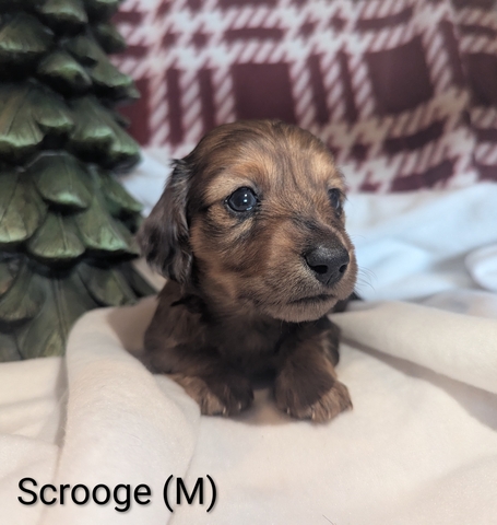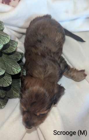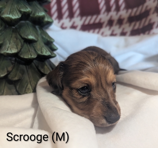 Long-Haired Mini Dachshund - Scrooge (Male) Full AKC Registration, AKC Re-Unite Microchip, first round of vaccinations, dewormed, vet health check, and a Puppy Starter Pack! Raised in the home with family and other dogs. Born 11/7/25 weaned and ready to go before Christmas! Located in McPherson KS. $1,500.