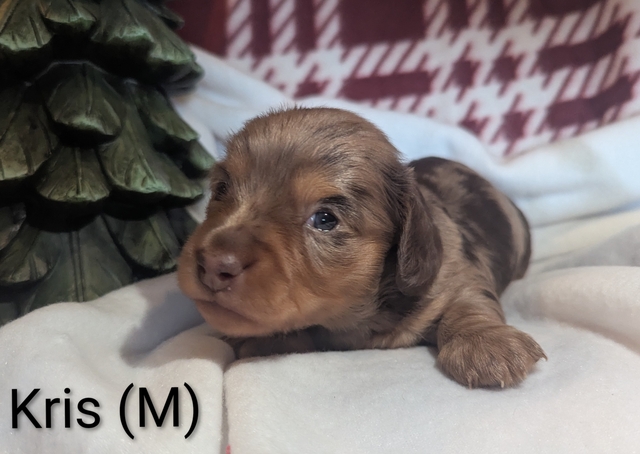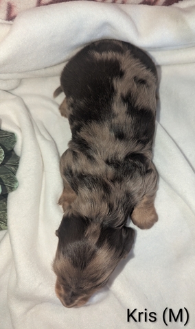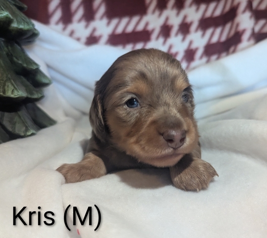 Long-Haired Mini Dachshund - Kris (Male) Full AKC Registration, AKC Re-Unite Microchip, first round of vaccinations, dewormed, vet health check, and a Puppy Starter Pack! Raised in the home with family and other dogs. Born 11/14/25 weaned and ready to go the week after Christmas! Located in McPherson KS. $1,500.