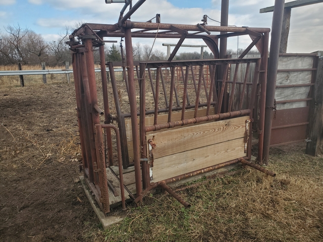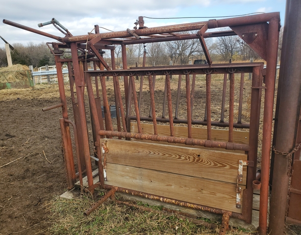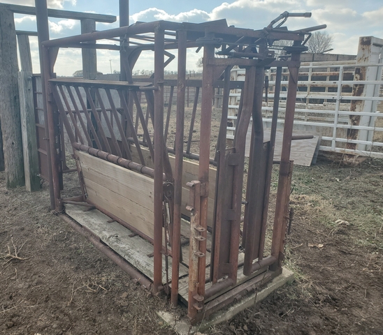 Older WW Beefmaster squeeze chute with self-catch headgate and quick side release. New wood kick panels. Still works great! $2200 cash only.
