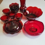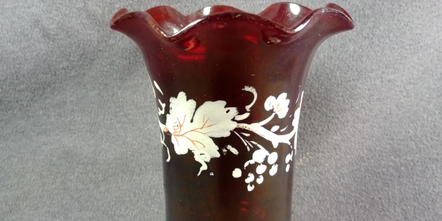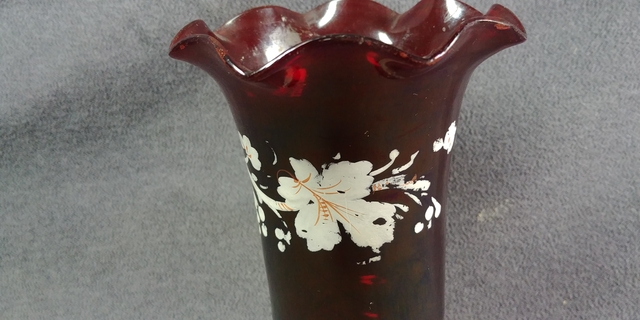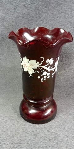 A ruby red vase with ruffled rim and hand painted white and red flowers.