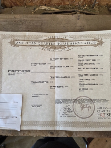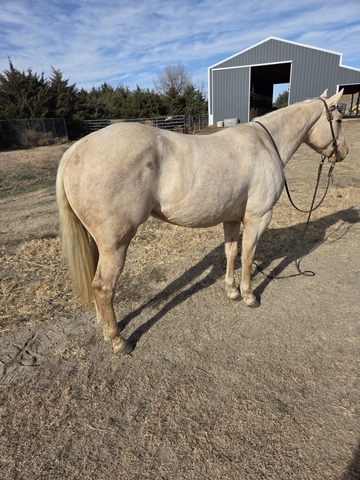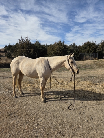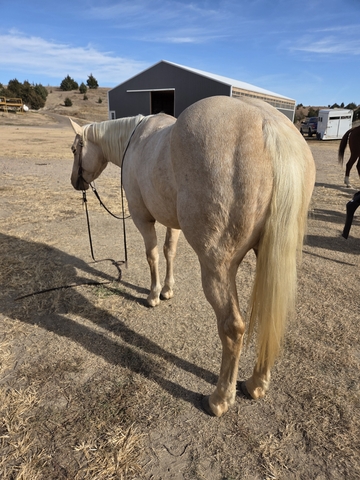 "TT PRETTY PETTEE" is a quality 3 year old palomino mare standing 14.2 with excellent confirmation. This mare has a gentle disposition and aims to please. Been rode around the ranch, cattle and rode in town. She has an excellent start with 60+ rides and showing great potential. Contact Clemens Yoder with Yoder Horse Training 308-537-6640.