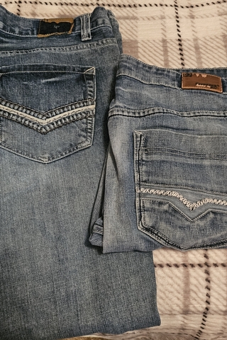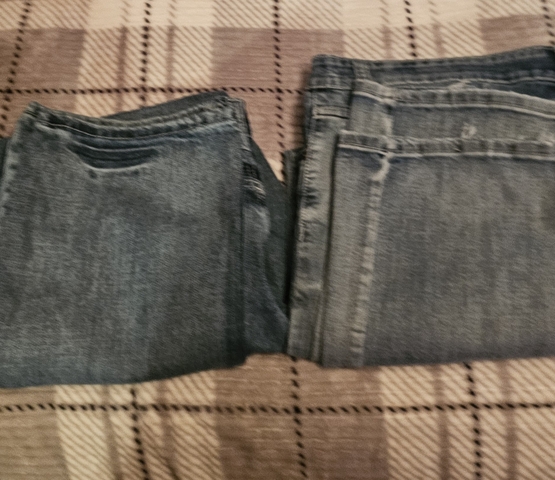 2 pairs. Pair w worn label.. no wear on bottom of leg. No holes . Pair on thr right.. no holes average wear on bottom.