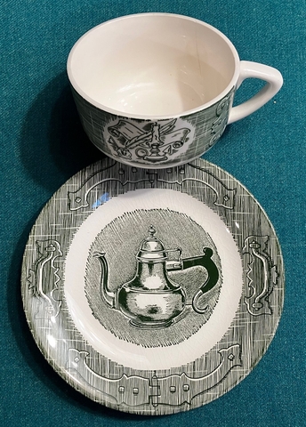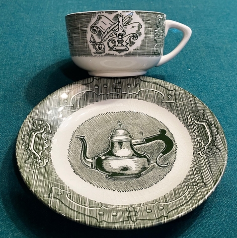 As stated The Old Curiosity Shop, coffee, tea and saucer or bread plate. 12 sets like the one shown. $8 per set, cup and saucer.