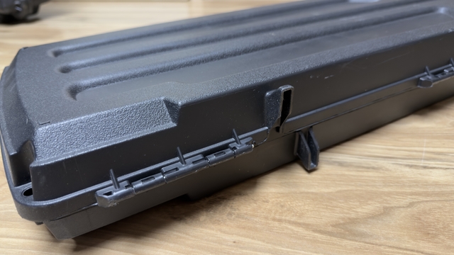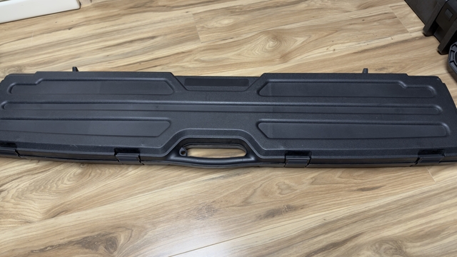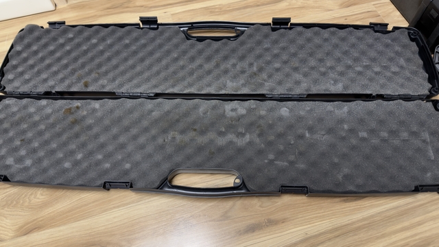 Black rifle case, slightly used and in good condition. Brand is unknown. Housing is hardened plastic with foam inserts that are removable.