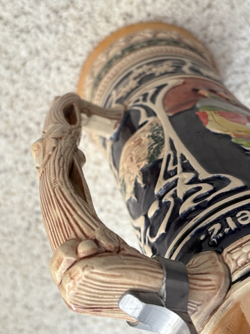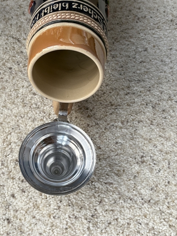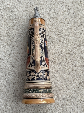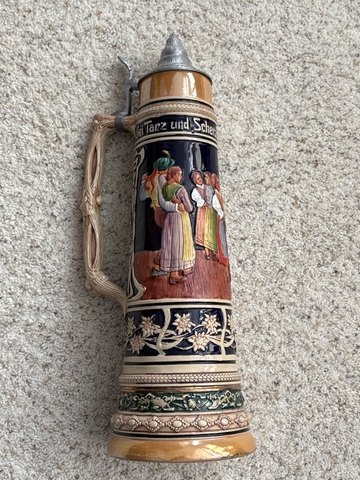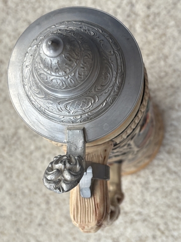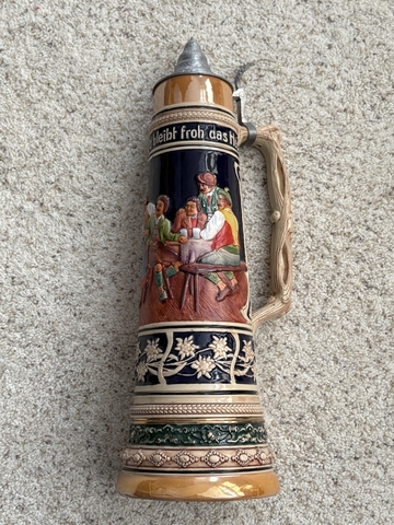 German Beer Tankard Stein by S.P. Getz. Pewter lid, Hand Painted Tavern scene,