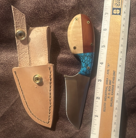 Modified Skinner has turquoise, red heart and curly maple handles. $60.00