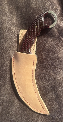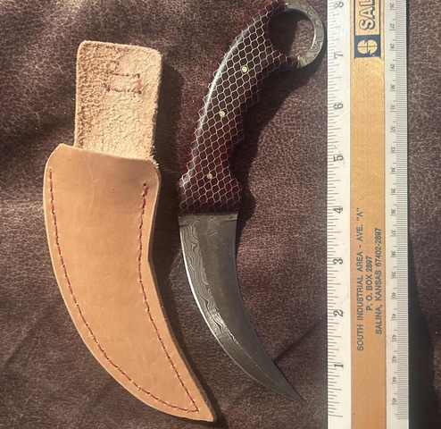 Damascus Karambit has 1/8 inch honeycomb red poly resin handles. $75.00