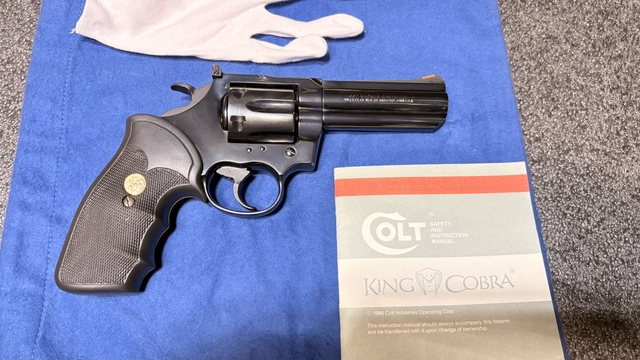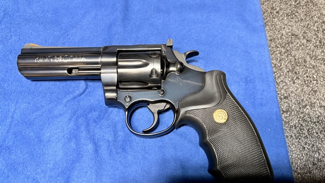 Stunning all-original Colt King Cobra revolver manufactured in 1988 per serial number thru Colt with a 4" inch barrel in the factory Royal Blue finish. Collector condition and these factory-blued Colt King Cobras are scarce. This particular revolver is in excellent condition overall and the blue shimmers. The cylinder and barrel appear be unfired with manual and box. The factory Royal Blue finish has a very faint drag line around the cylinder, possible dry firing. The bores in both the barrel and cylinder are excellent and bright. There are no visible imperfections in either and the rifling looks brand-new. The 2 piece checkered black rubber finger-groove grips are in excellent condition. Both sides have beautiful golden Colt medallions in them and are free from any damage or wear. The action on this Colt is smooth and precise. If you have been looking for a very nice all-original blued King Cobra for your collection this gun would be an excellent choice. Please look at all pictures, if you have any questions please ask. Prices are over 2k+ on gun broker and other sites at this time and will olny go up.