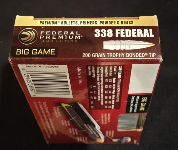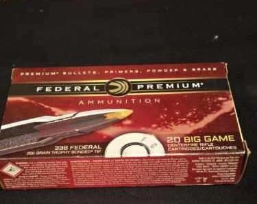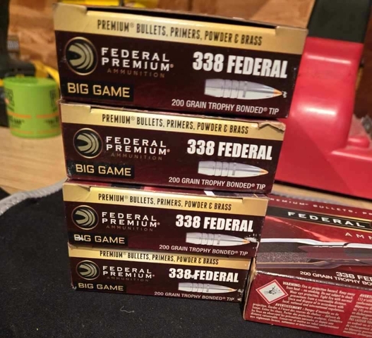 5 Boxes of New 200 gr Trophy Bonded Tip ammo in 338 Federal (not win mag). High Grade ammo. $3/round
