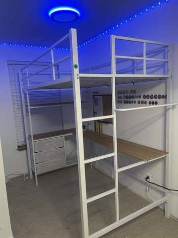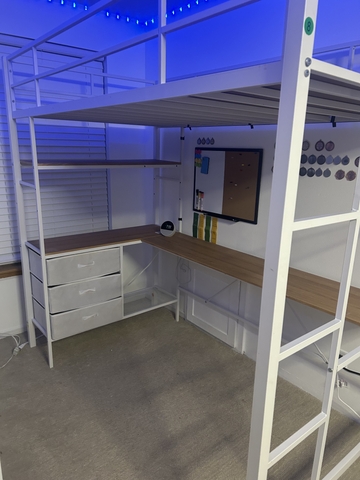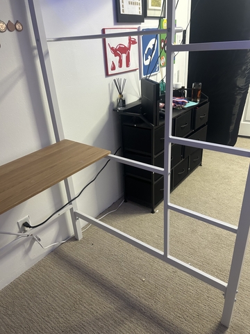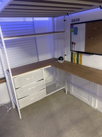Twin size loft bed with desk underneath. Wants to upgrade to a full so needing to get rid of this one. It's been taken apart so it's ready to go. Board on top is not included don't have room in our storage so need it gone asap! Asking $115 located in Logan. Call or message 785-533-4008 with any questions