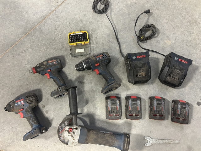 Bosch 18V power tool set. Has the 1/2" drive impact, drill, 1/4 hex drill, grinder and 4 batteries with 2 chargers. All used but everything works. $225 OBO, consider trades for anything.
