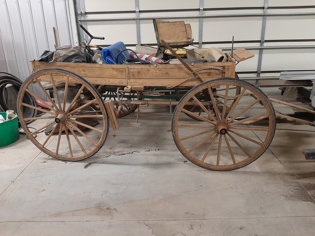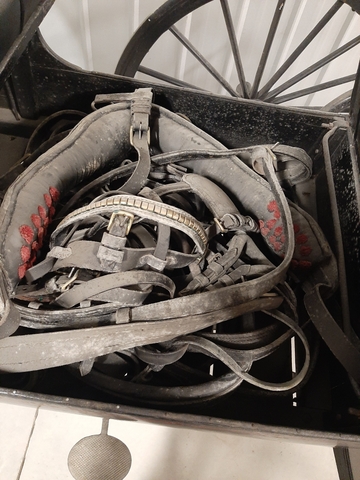 Horse drawn wagons and sleigh. Harness, fly net, wagon jack.