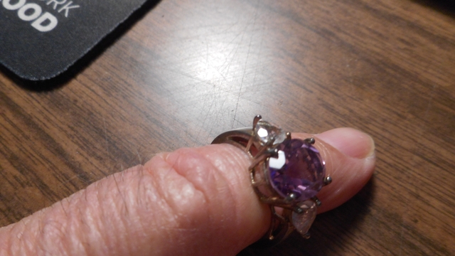 Set in Sterling Silver . 1.32 ctw Amethist stone with two 1/2 cwt Topaz stones one on either side .45.00 .. size . Size 7 " New Price " 70-61-31-060