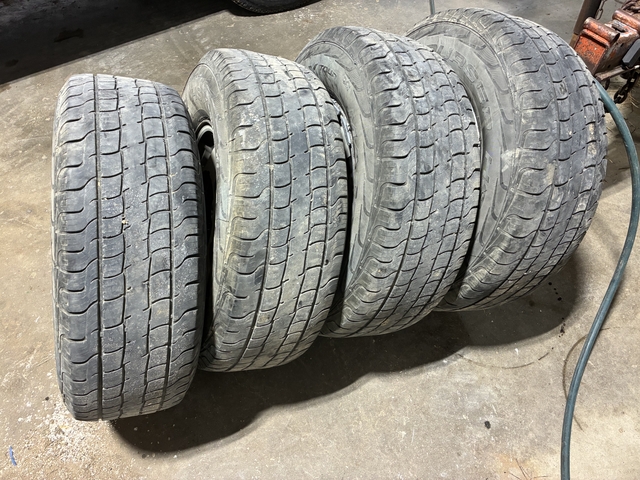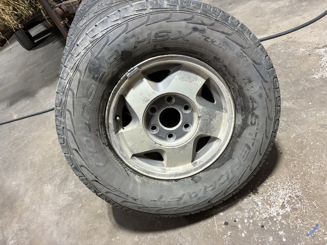 Tires and rims off of a 94 Chevy half ton pick up. 265/75R16. All tires hold air. 1/4 tread left. Have lug nuts to go with them.