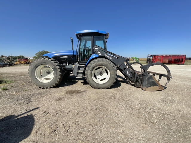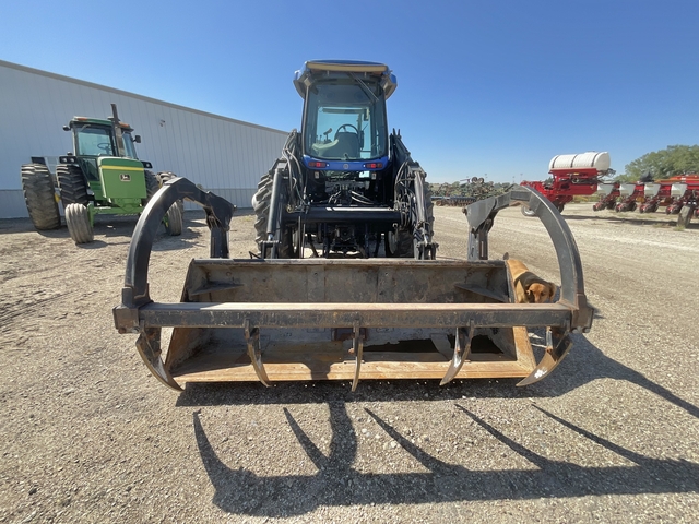 1999 New Holland TV140 tractor with grapple bucket loader, 4WD, 140HP, showing 7700 hours, 3 rear hyd remotes, has 34 front weights (67lbs each), New Holland 7614 grapple bucket loader, S/N: D204067,Transportation & Financing available