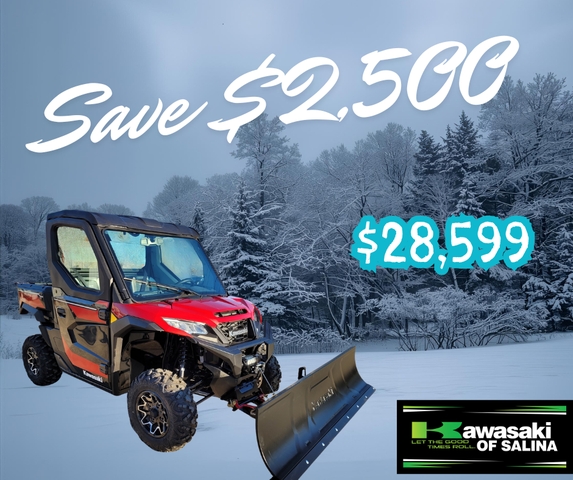 Save over $2,500 on this Kawasaki Ridge with factory snow plow and winch! MSRP $31,154, our price $28,599! (for a limited time interest rates as low as 2.95 for 36 months for qualified buyers)