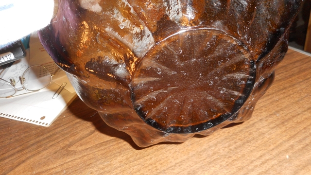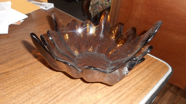 shimmers of gold are reflecting when a small amount of light is added to the copper brown glass bowl . Has a ring to it when thumpped . 5" X 10-1/2 " as in a cristal punch bowl .