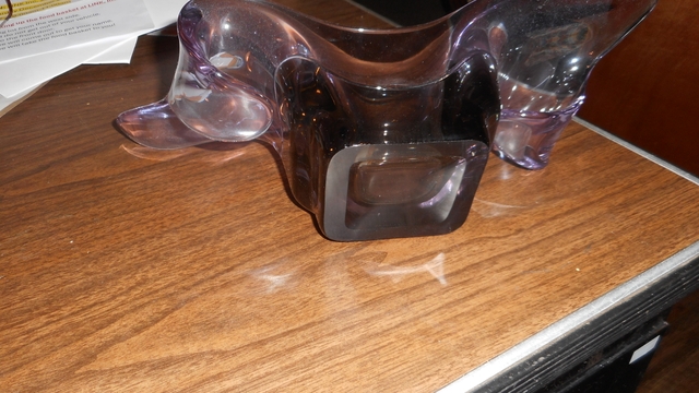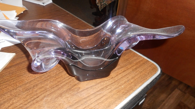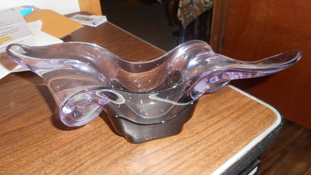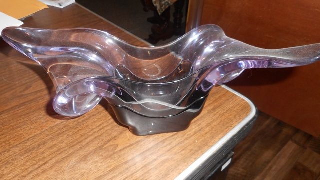 5 " X 14 " t 5" Decorative bowl beauitively designed almost looks like it was hand blown . Very lighr violet in color has a square flat bottom good balence . 10.00 or besr offer