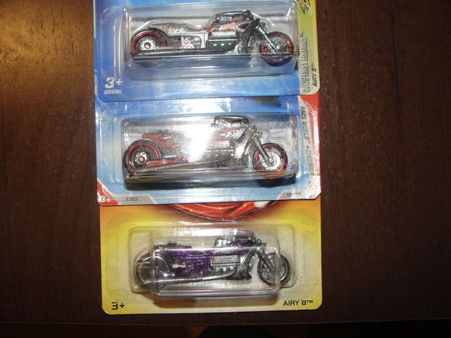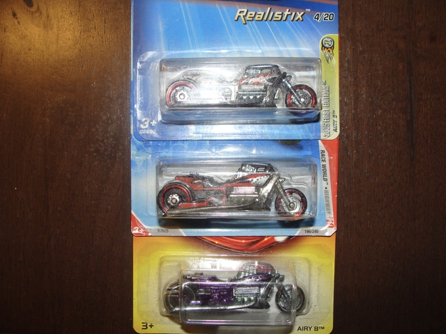 Selling 3 Hot Wheels Airy 8 toy motorcycles. check other listings for more vehicles, will help with shipping if needed