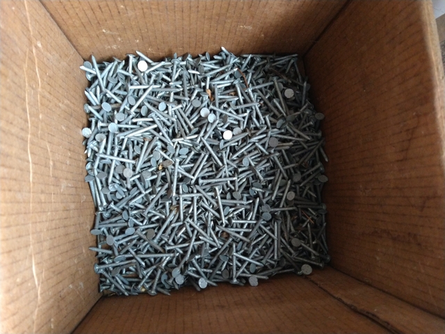 1 1/2" roofing nails. Galvanized. Approximately 10 pounds.
