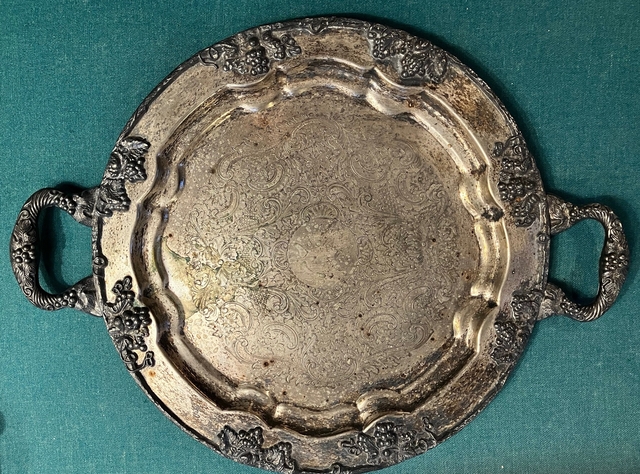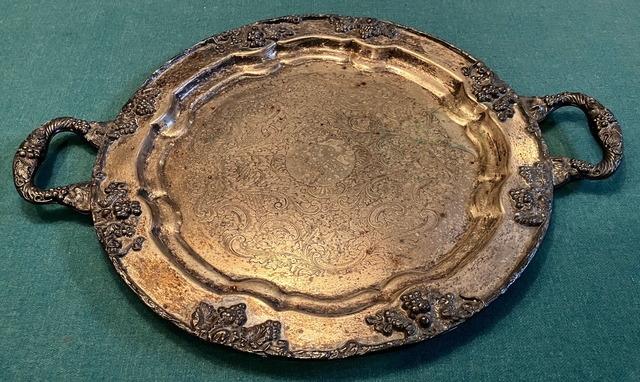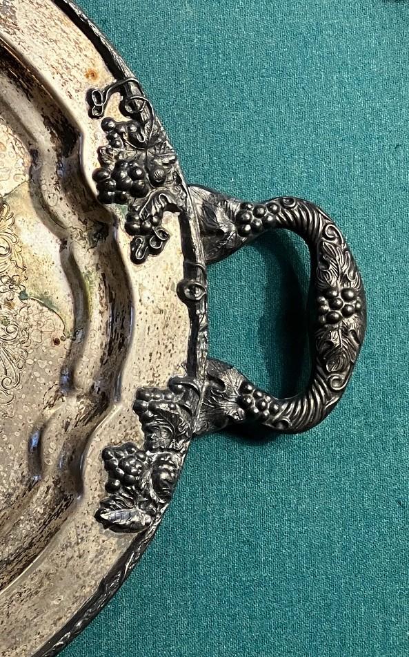 Silver serving tray, charger, platter. About 19" from handle to handle. Needs a good polishing..States on the back: Sheets Rosckford, 1875, Made on Copper