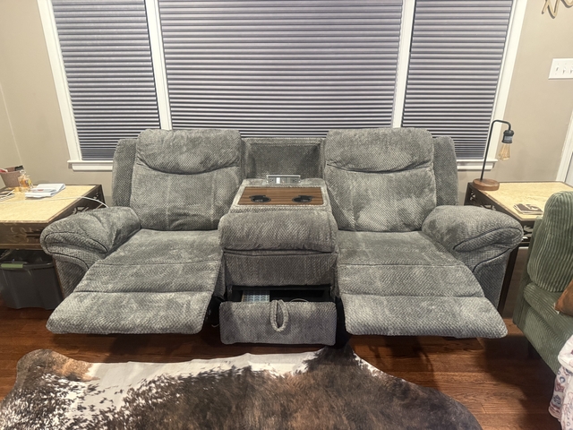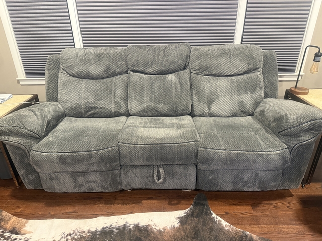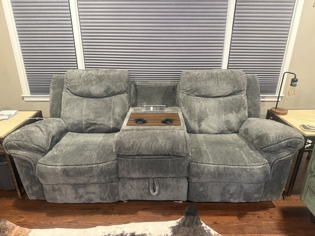 Manual reclining sofa with drop down center console.