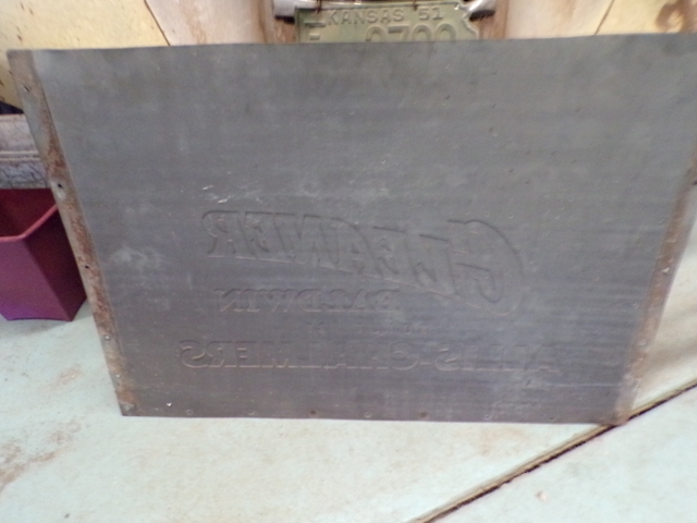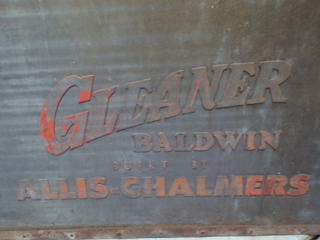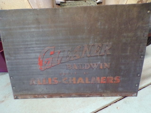 Old Gleaner Baldwin metal sign with embossed lettering. Cool old display piece. 36" x 24". Call 6206176644 - emails & texts are usually ignored as a scam.