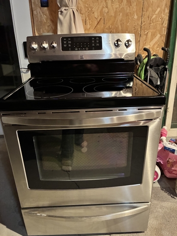 Kenmore smooth top range. 4 burners plus a warmer and rapid boil option. 3 rack self cleaning oven. For more information contact 785-208-9042