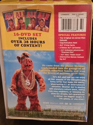 THE COMPLETE 16-DVD SET, INCLUDES OVER 38 HOURS OF CONTENT. NEW, NEVER PLAYED, STILL IN SEALED BOX.Would make great Christmas present for ALF LOVERS!! Call AND LEAVE MESSAGE WITH phone number , No texts, between 9Am -8PM (located in Salina,Ks)