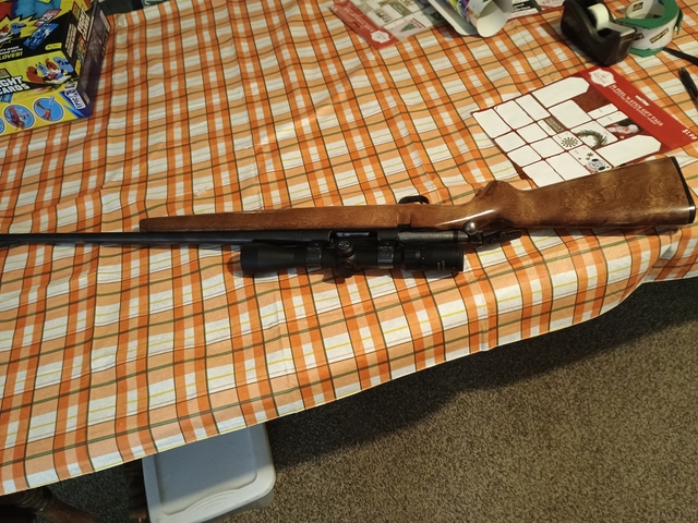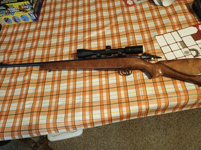 Mossberg 243 win with Simmons scope 6209600387 it's a good looking gun wood stock