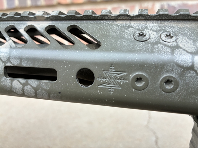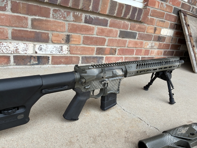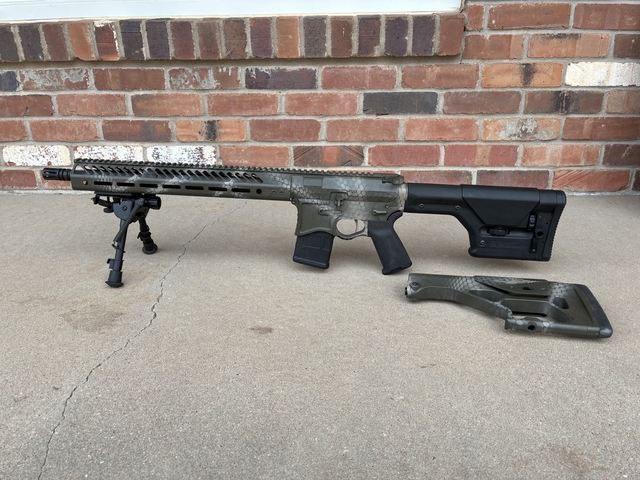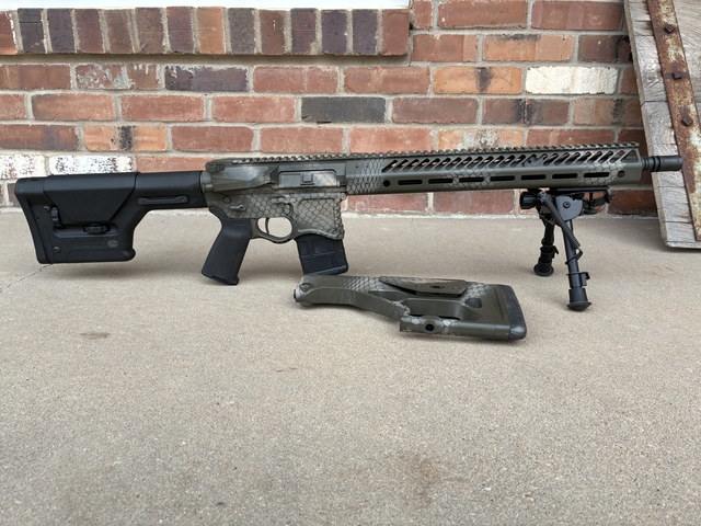 Seekins DMR in 223 Wylde. Timney 2.5 lb single stage trigger. Magpul PRS stock. Seekins adjustable gas block. Custom Duracoat. Comes with 20 rnd mag and Harris 6-9" bipod. Has been used as a coyote rig. Has around 500 rnds fired. Shoots .5" moa with hand loads. Been a very accurate and reliable rifle. Pics show original Seekins stock. I lost the push button for the cheek piece. It's included also.