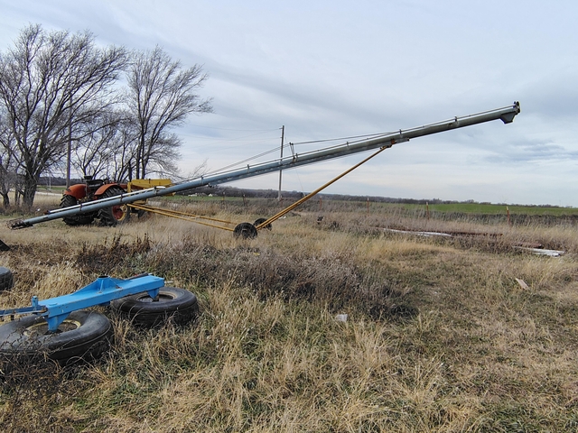 Here we have our Hutchinson 52-8 grain auger. As you can see in the video it runs good and is straight. Winches up and down and is in pretty good condition. Haven't used it myself other than testing it. Pulled it down from Concordia earlier this year.