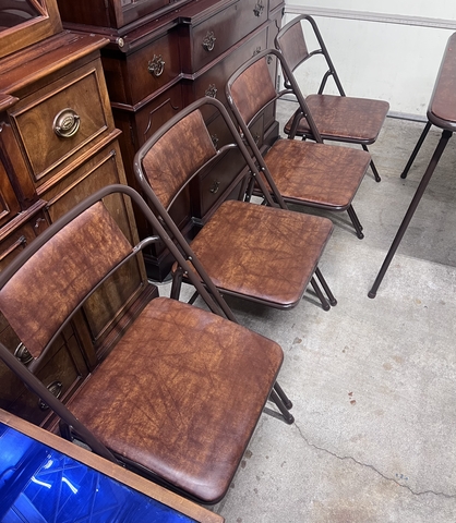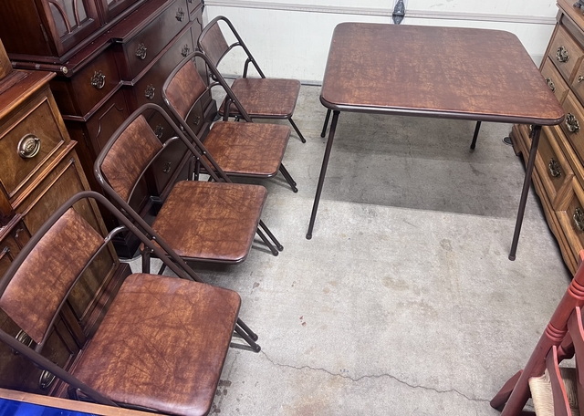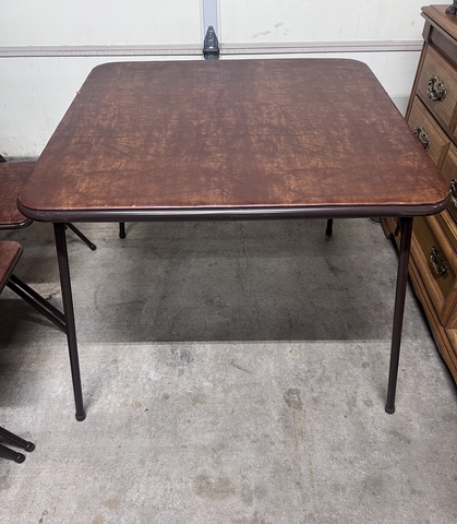Have a Vintage Cosco Card Table W/4 Chairs, all fold up for space saving when not in use. Table has locking legs, Chairs are good, but 1 chair is slightly bent down on seating area (Pictured). Table has a small imperfections on edge (Pictured). Table measures 34 1/2” Square. (NO HOLDS)(No Deliveries)(CASH ONLY) LOCATED IN HAYS, KS