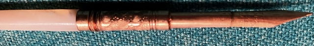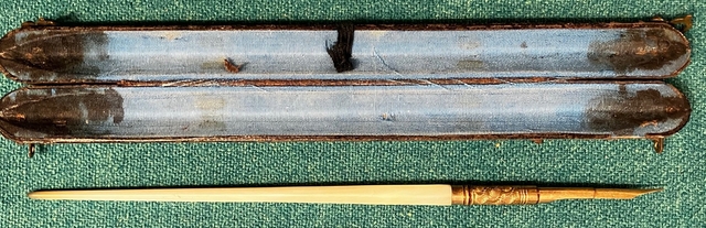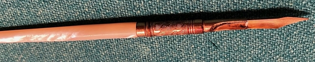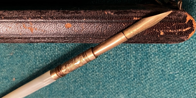 Late 1800's, with Mother of Pearl handle. 6" long in original carrier. Nib is marked FT Pearce, R. I.