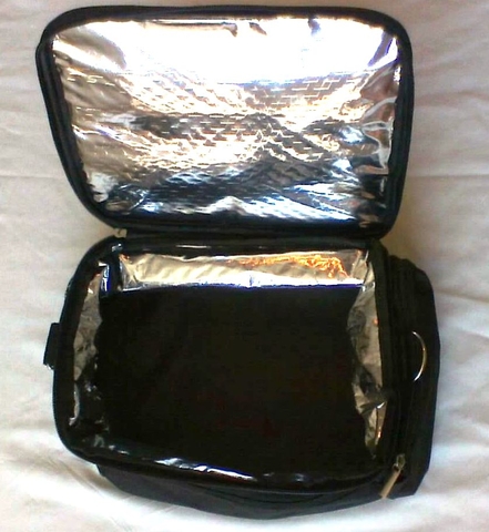 Insulated lunch box - $8.00 9” x 12” & 5” tall. Has 4 separate compartments. Foil lining to help keep foods hot or cold. Includes a carry strap.