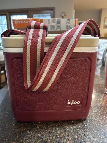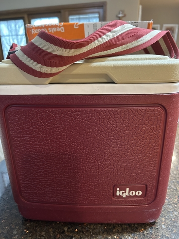 A good size cooler to carry drinks and sandwishes in. In good shape and is very sturdy. Has a strap that can be put over the shoulder or head.