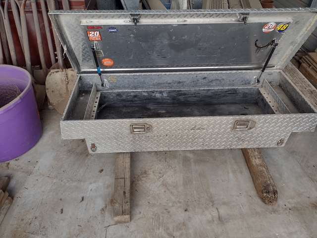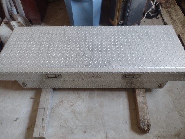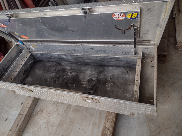 This is a nice aluminum tool box that fits a small pick up bed. Overall width is 5'. It does not have a tray. The latches and struts work good. Keeps your stuff out of the weather.