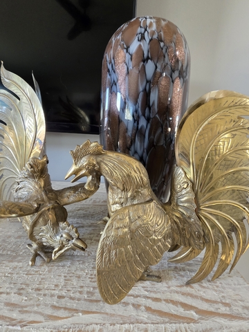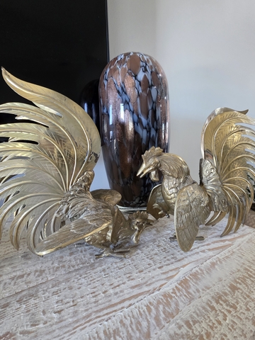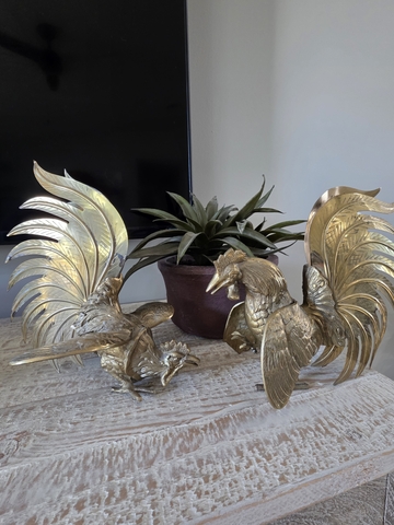 BRASS Fighting Roosters. Intricate, lifelike details. Collectible for their age and craftsmanship. Approximate size 9"tall, 8"wide, & 10.5" long. Located in Belleville KS.