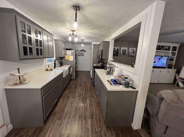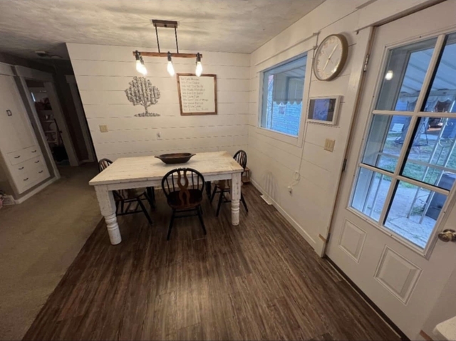 The home consists of a completely updated kitchen, with custom cabinets with soft-close pullouts and quartz countertops. The floor has new subfloors and simulated wood plank flooring. Appliances are included. The dining room is adjoining the kitchen. The laundry area is at the end of the kitchen.
