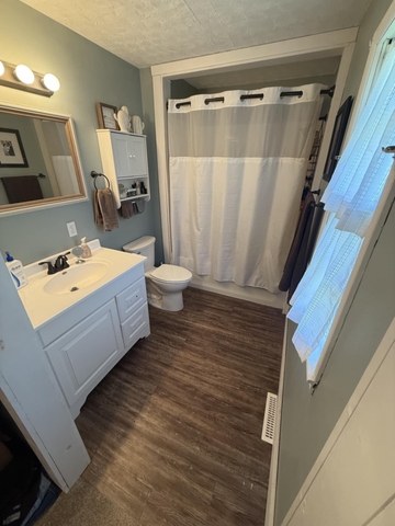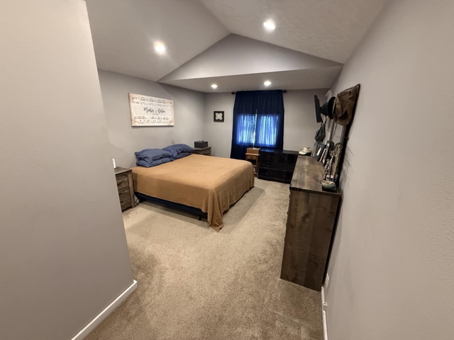 The Master Suite is a very generous size, with cathedral ceilings, walk-through closet, and full bathroom. This is a three bedroom, two bath house. The other two bedrooms are nice size, with closets and carpeting. There is a second full bathroom.