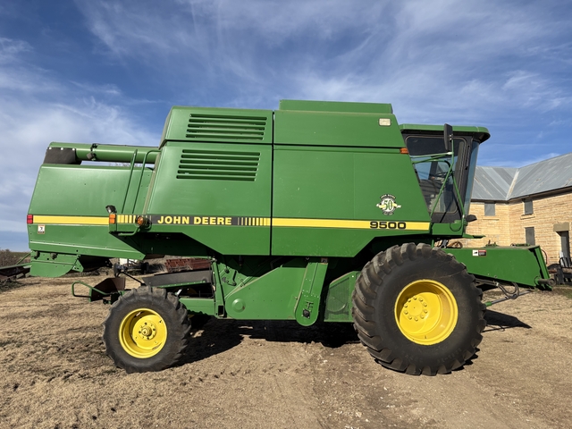 John Deere 9500 Combine, 2768 Engine hrs, 1929 Seperator hrs, Great front tires, Straw Chopper, comes with JD 925 Rigid Header. Always shedded. Price: $35,000