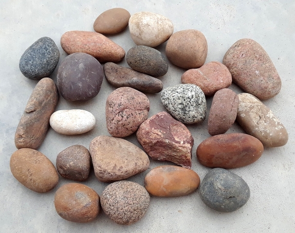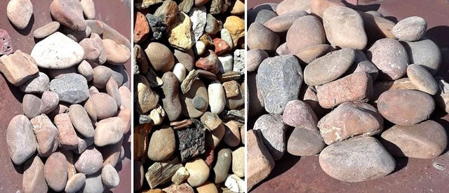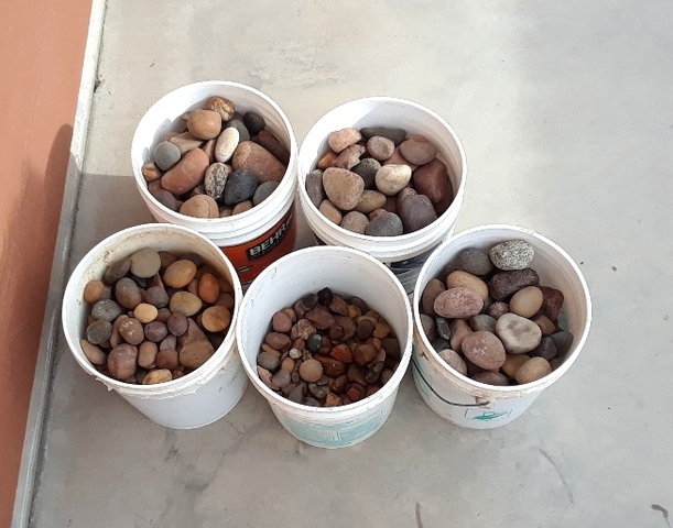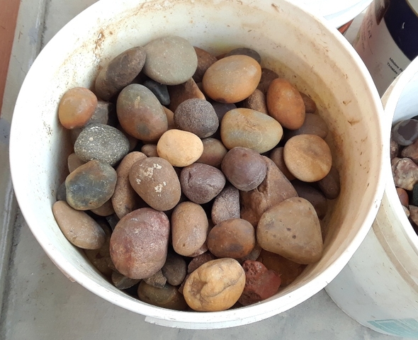 Montana River Rock - $12.00 Selling 4½ – Five gallon buckets of 1” to 4” decorative landscape Montana Round River Rock. Ideal for your landscape area. My dad individually picked out these very nicely rounded rocks from a quarry site in Montana, but he never had the chance to place them in his rock garden. Most are 1” to 3” in various colors, reds, tan, dark gray, brown, black, off white, light gray and light brownish reds. $12.00 per bucket or buy all 5 buckets for only $50.00 The one bucket is half full of smaller rocks with more small reddish colored rocks.