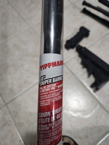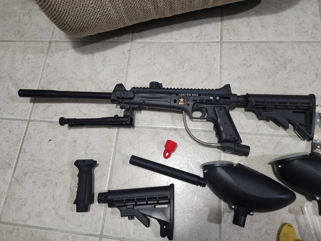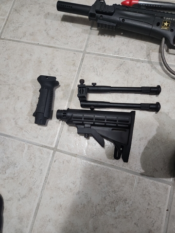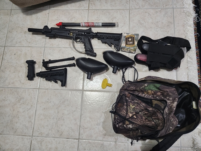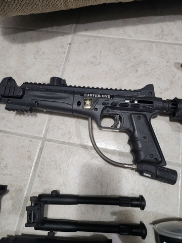 US Army Paintball gun made by Tippmann. Comes with two hoppers, two pods with carrying case, barrel plug, barrel cleaner, bipod, forward grip, extra adjustable stock, extra 16" sniper barrel and camo backpack. There are some extra parts like o-rings that are included. I believe i have a mask somewhere that i can throw in. First picture shows the stock setup and the second show the sniper barrel with bipod attached.