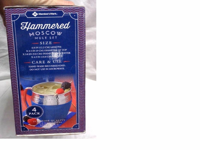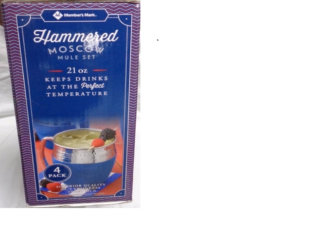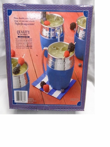 4 21-oz stainless steel blue/silver mugs. It is perfectly acceptable to use them for drinks other than Moscow Mules, I will add pix tomorrow.