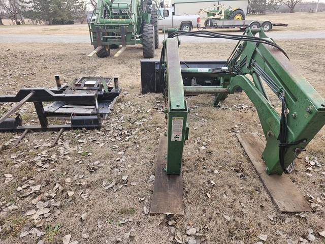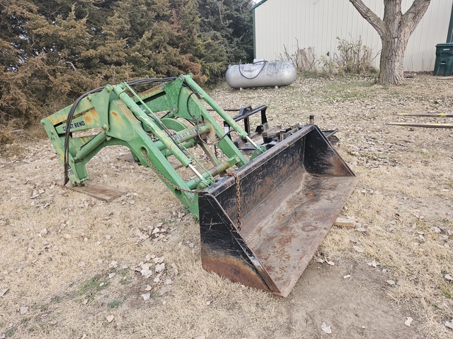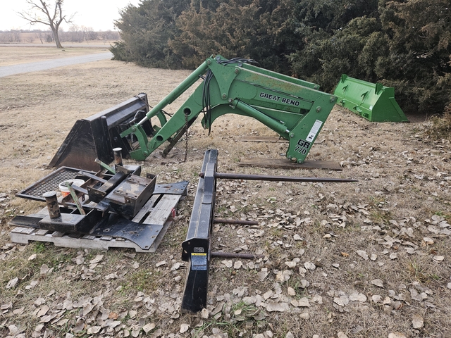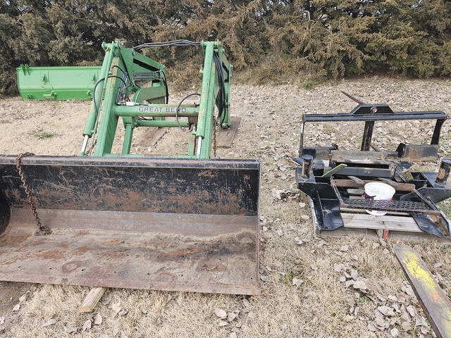 Here is a very tight GB 770 Self Leveling Quick-Tach Loader. Also the easy Quick-Tach Bucket. Pins are very tight and loader shows almost no wear. Comes with GB Quick-Tach bale spear. Was on a 4320 JD, but should fit the 20, 30, 40, 50 Series Tractors as well as some Front Assist Tractors. May fit other brands as well. This is a late loader in very good shape. Near Salina, Ks