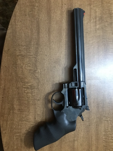 Up for sale is a Dan Wesson 15-2 357 mag with 8 inch barrel. Has hogue grips on it right now, but does come with original wood set. Leather holster goes as well.