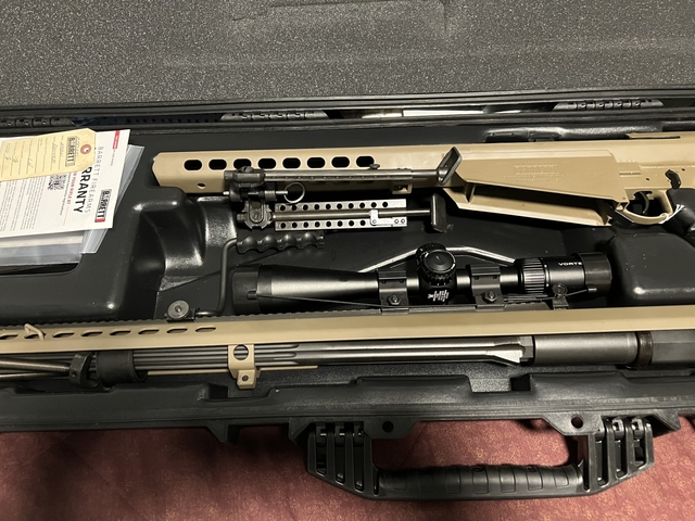 I bought it and have never shot it. Its a 29in barrel and comes with 300 rounds linked in 2 seperate ammo boxes.Vortex Viper PST 5-25x50 Scope.No Trades without Cash on top.