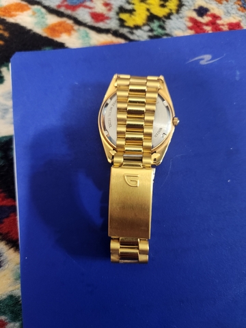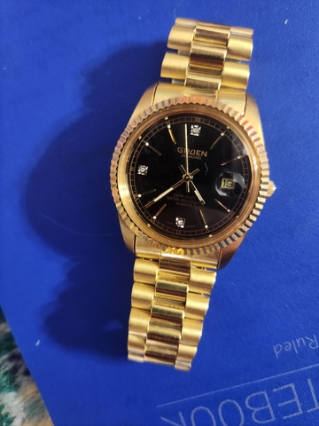 The Vintage Gruen Diamond Quartz Watch is a classic timepiece with a gold bezel and bracelet band. Japan movement, 35mm case, 3ATM 100ft water resistant. Just put a brand new battery in it and it runs perfect. There are some stuff marks on the crystal and bracelet, but otherwise in good condition.