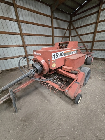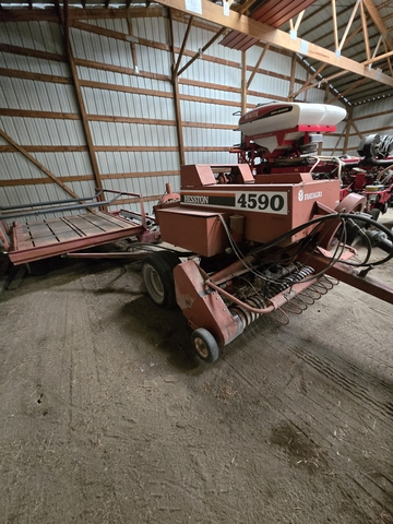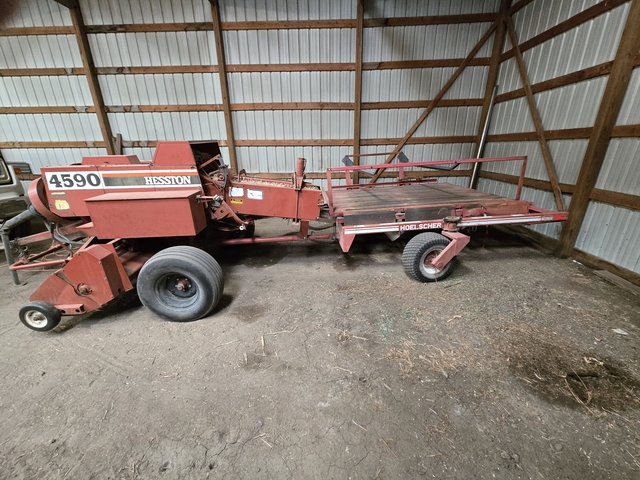 Hesston 4590 inline small square baler and Hoelscher accumulator. 540 pto, wide pickup, twine tie, hydraulic bale tension, extra parts and manual